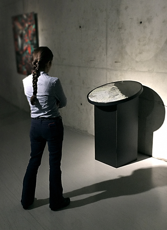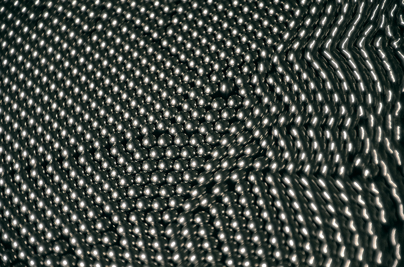 Macrocosm consists of iron marbles placed in a radial surface and an engine making it spin. Different combinations of geometric form and sound arise out of this loop by the connections between the marbles. The movement of the sound and the impact of variable forms create a hypnotic experience for the audience.