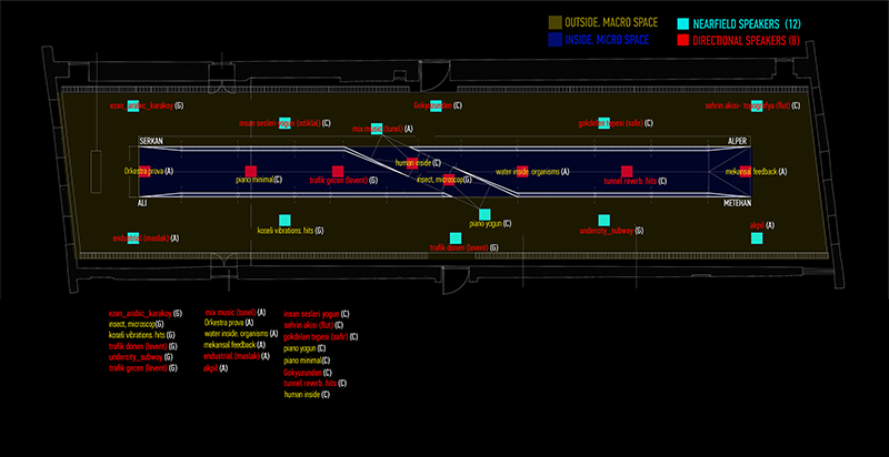 ‘’There are different feelings or senses that help us feel the space. One of the important issues for me in creating the conception of my work that is the relationship between sound and space with different scales (macro-micro). I will record sound from different places but I will not use them as they are. I will try to find out the characteristic structure of sound in these places… try to apply almost a microscopic view to extract the fundamental elements of their structures, and then I will try to create a simulation, a new sound based on the abstraction of the structure… The irregular and versatile structure of sounds that come from a variety of sound sources with different temporalities is another important aspect. In this way, unexpected relationships and structures of sound appear… It is like observing a natural phenomenon, you experience a whole formed of the combination of different possibilites which emerge beyond your control, and you become part of it. At that point, you set your concerns, or your conceptual thinking habits aside, become part of the whole and the flow, and experience the moment…”